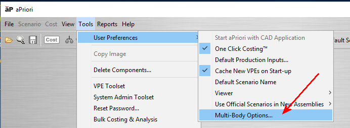 As of release 2019 R1, aPriori Professional provides a preference setting for Multi-Body Options. This enables you to specify how aPriori should interpret CAD model files that contain more than one distinct solid body.