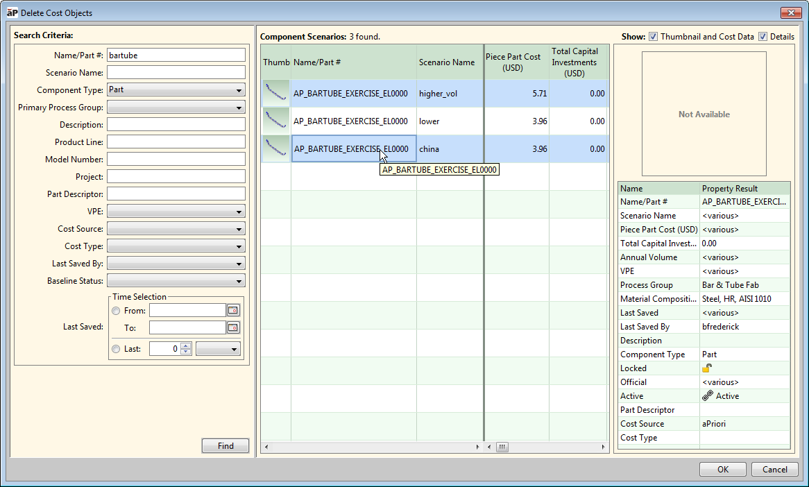 Delete Cost Objects window, search for the scenarios of interest. (See