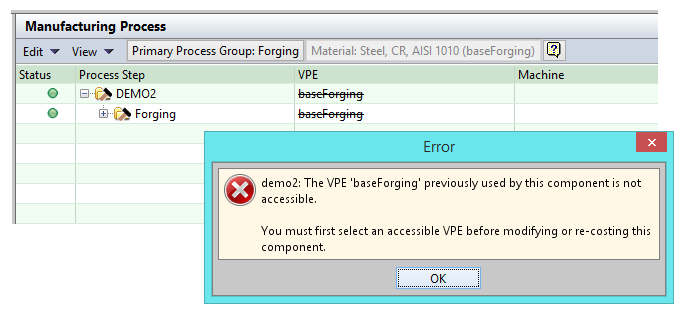To view an existing, costed component, you do not need VPE access. However, any VPE to which you do not have access that appears in the Manufacturing Process pane is displayed with a "strikethrough" name (similar to a deleted VPE).