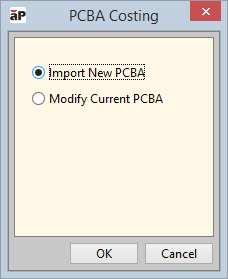 2 IF you already have a PCBA open, aPriori prompts you to specify whether you want to import a new PCBA for the first time, or modify the settings of the open PCBA. Select Import New PCBA then click OK. (If no existing PCBA is open, aPriori assumes that you are importing a new PCBA and takes you to the next step.)