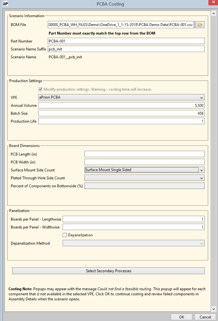 VPE – It is critical that you select a VPE that supports PCBA. In most cases, aPriori will not display any non-PCBA VPE. But if your system for some reason is configured to allow this, be aware that selecting a non-PCBA VPE (such as “aPriori USA”), will cause your costing attempts to fail.