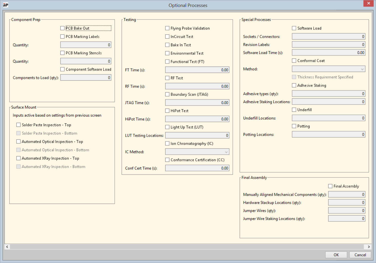 4 Use the Optional Processes dialog to indicate which processes should be executed for this PCBA.