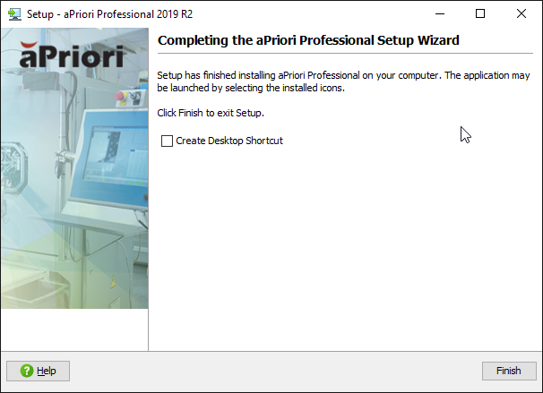 To add a shortcut for aPriori Professional to your computer desktop, select the Create Desktop Shortcut checkbox.