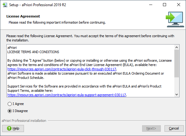 The License Agreement window allows you to review the terms for installing and using aPriori Professional.