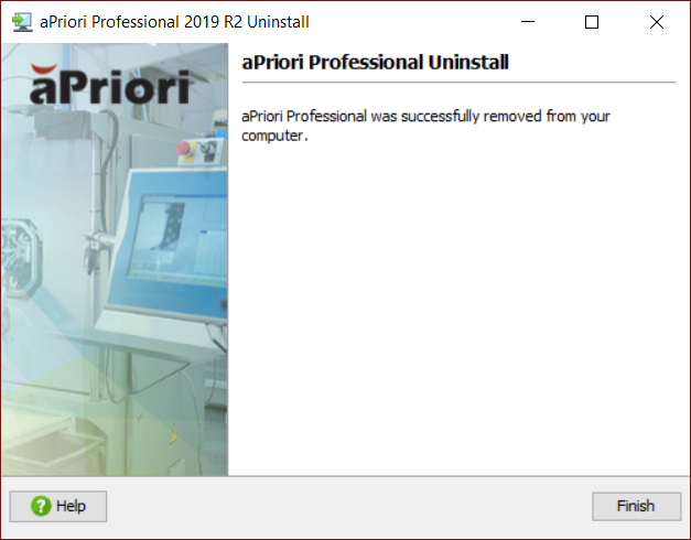 This screen appears when the uninstaller is done. Click Finish to delete any remaining files and close the installer.