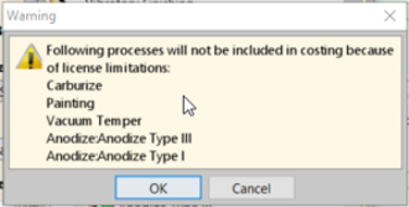 • Beginning in aPriori 2019 R2 SP1, users will be notified when they try to include secondary processes for which they are not licensed. This will occur when processes are included either via the Optional Process Overrides panel in the Cost Guide or via the Routing Selection dialog. A message similar to the one shown below will be displayed prior to costing. Once the dialog is dismissed and costing proceeds, no unlicensed processes will be included in the routing or cost estimate, as also was the case in previous releases. The intent of this enhancement is simply to alert the user, as previously they may have overlooked that a requested process was not included.