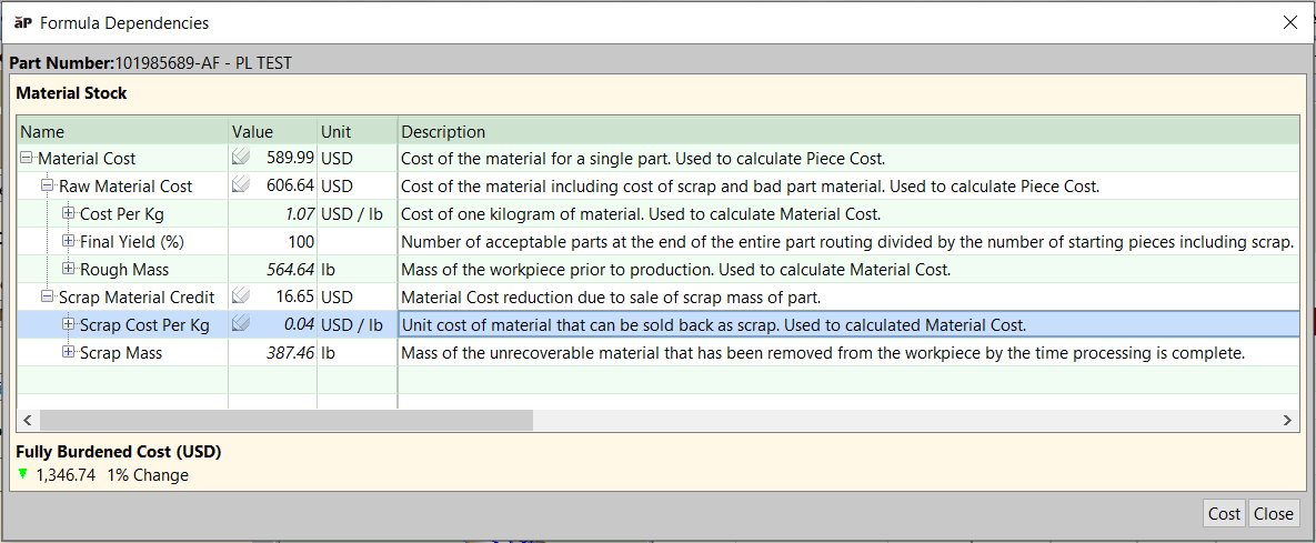 • This service pack provides an improvement to the Scrap Material Credit capability introduced in aPriori 2019 R2 (also known as Scrap Buyback). Now the Formula Dependencies dialog will display the calculated scrap material unit cost, for all processes that support scrap buyback calculations. Previously the dialog displayed only terms which are used to compute the scrap material unit cost: the raw material unit cost and the percentage of that raw material cost at which scrap material can be sold. Now the Formula Dependencies dialog will also display the product of those two terms. This is a usability improvement only; cost results will not be impacted by this change.