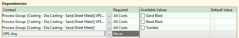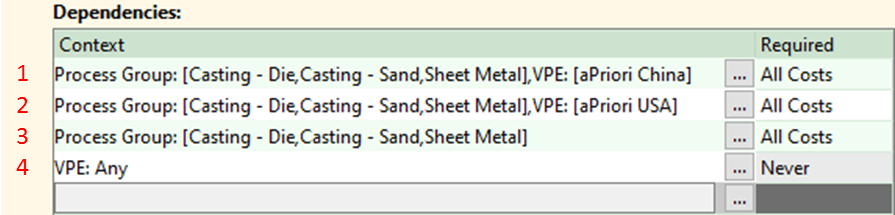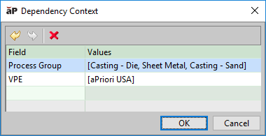 • Within a given Dependency Context, the logic is evaluated as “or” within a field and “and” from field to field. The context below would read as “if Process Group = [ Casting – Die or Sheet Metal or Casting – Sand ] and VPE = aPriori USA”