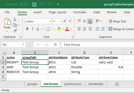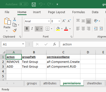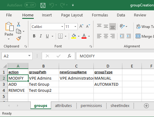• newGroupName – contains new group name in case of group modification (applicable only for MODIFY action). If value in this column is not set, then group name will not be changed.