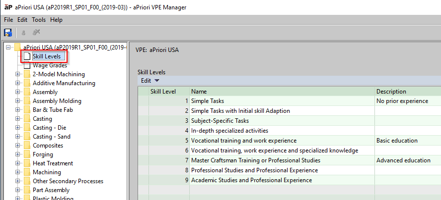 Click Skill Levels in the navigation pane of the VPE Manager.