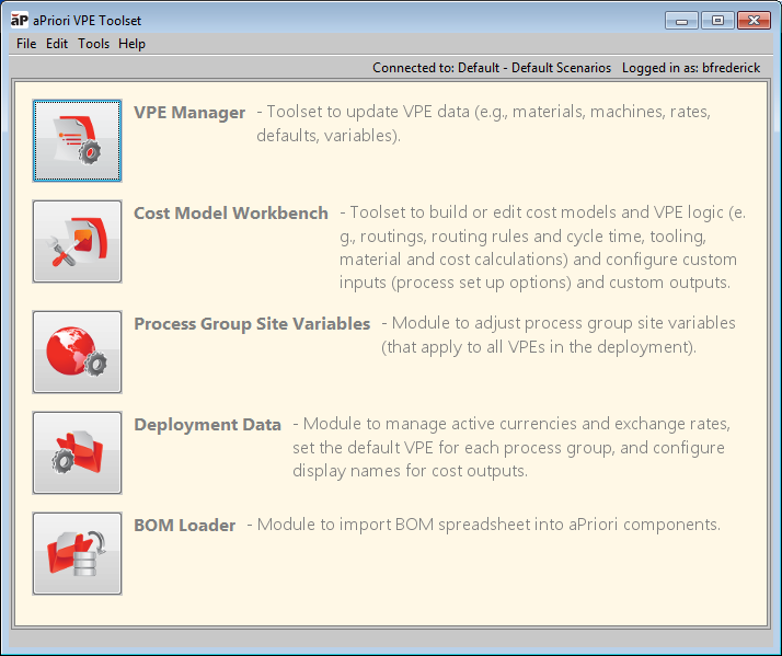 1 Select Tools > VPE Toolset from the aPriori menu bar to display the aPriori VPE Toolset window.