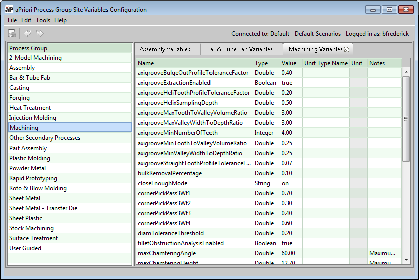The aPriori Process Group Site Variables tool allows you to edit the global variables for the aPriori application deployed at your site. It also allows you to export and import a deployment’s site variables; for example, it allows you to export variables from a staging environment and import them into a production environment.