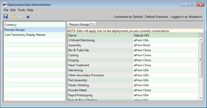 The Deployment Data Administration tool allows you to select the default VPE for each process group.