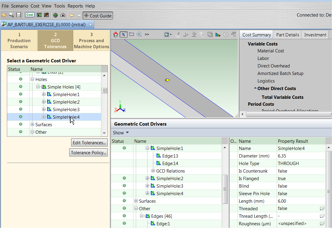 • For more GCD details, you can switch to the Geometric Cost Drivers panel and display the GCD Properties table to its right.