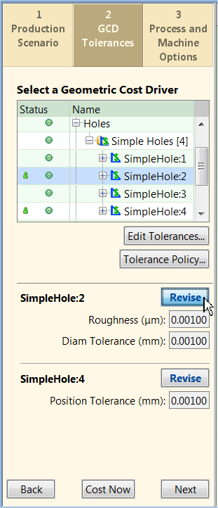 When done with the GCD Tolerances tab, you may click the Cost Now button or move to another Cost Guide tab by clicking the Next button at the bottom of the Cost Guide, or by clicking the Process and Machine Options tab at the top of the Cost Guide.