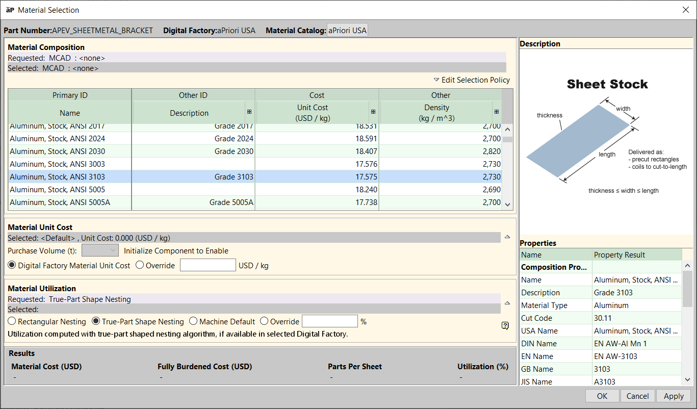 The Part Number and Digital Factory selected for this part are displayed in the window header. The list of materials shows all the materials available for the selected Digital Factory. Material automatically selected by aPriori is highlighted and the related properties are displayed in the Properties list. The Description panel shows material stock size and form.