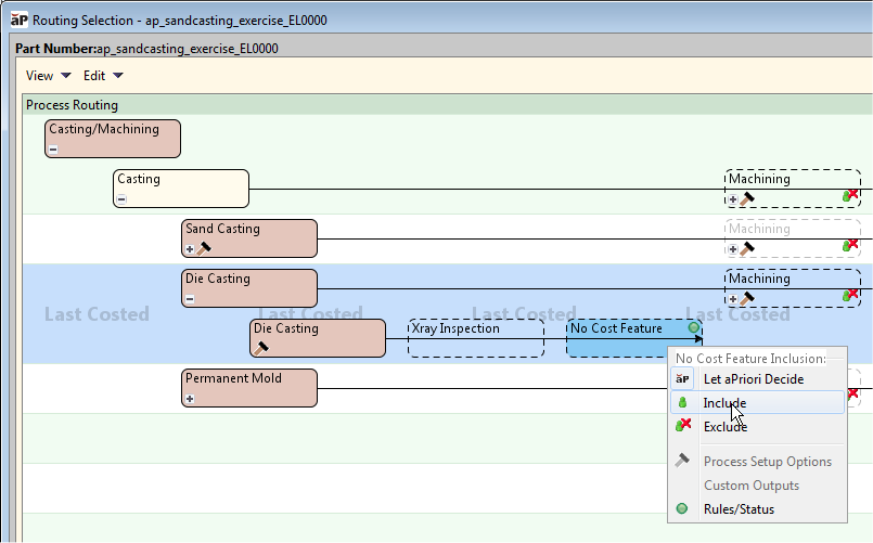In the Routing Selection editor, right-click the optional No Cost Feature operation and select Include. A sandcasting part is shown in the following example.
