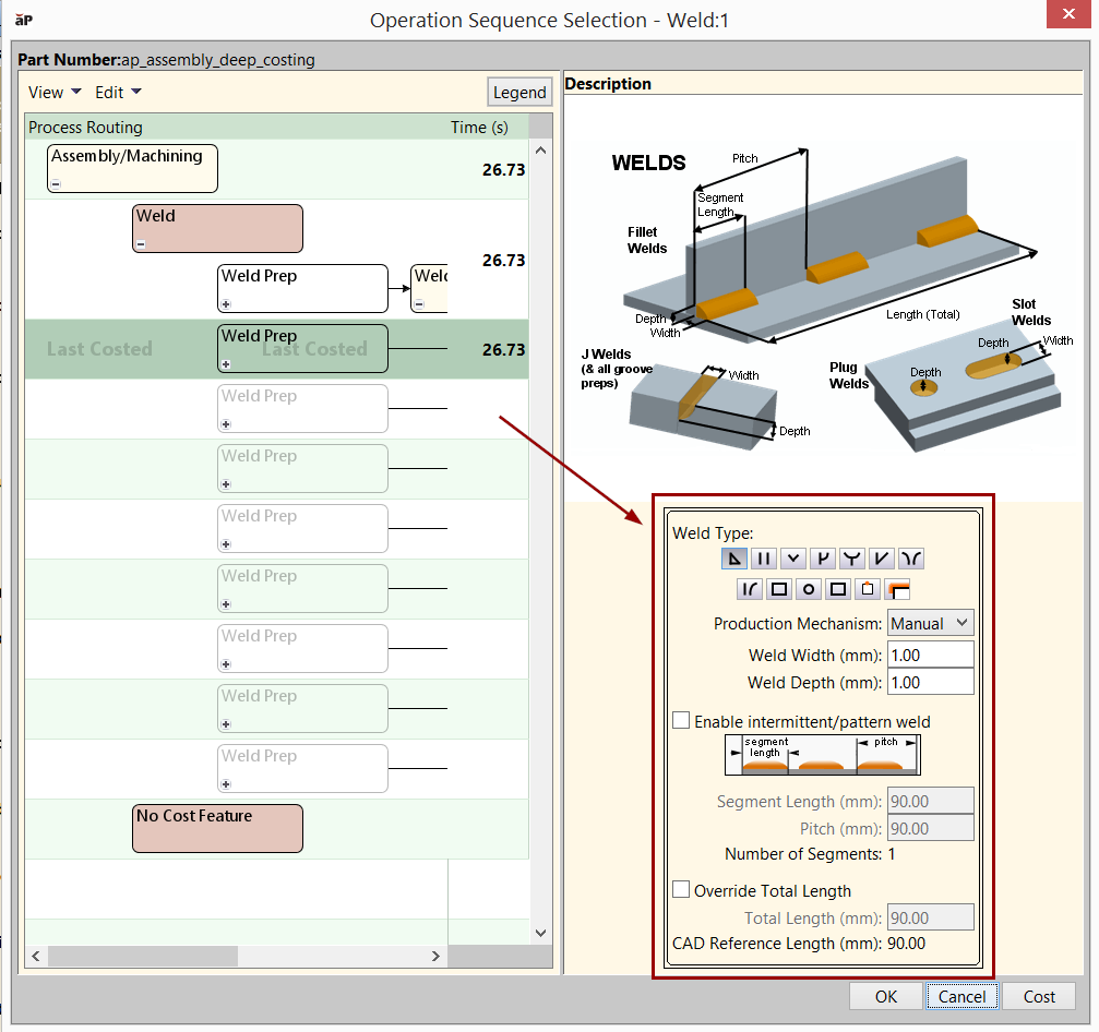 Note: Pro welds are available in aPriori only when you are working in Creo Direct Integration mode.