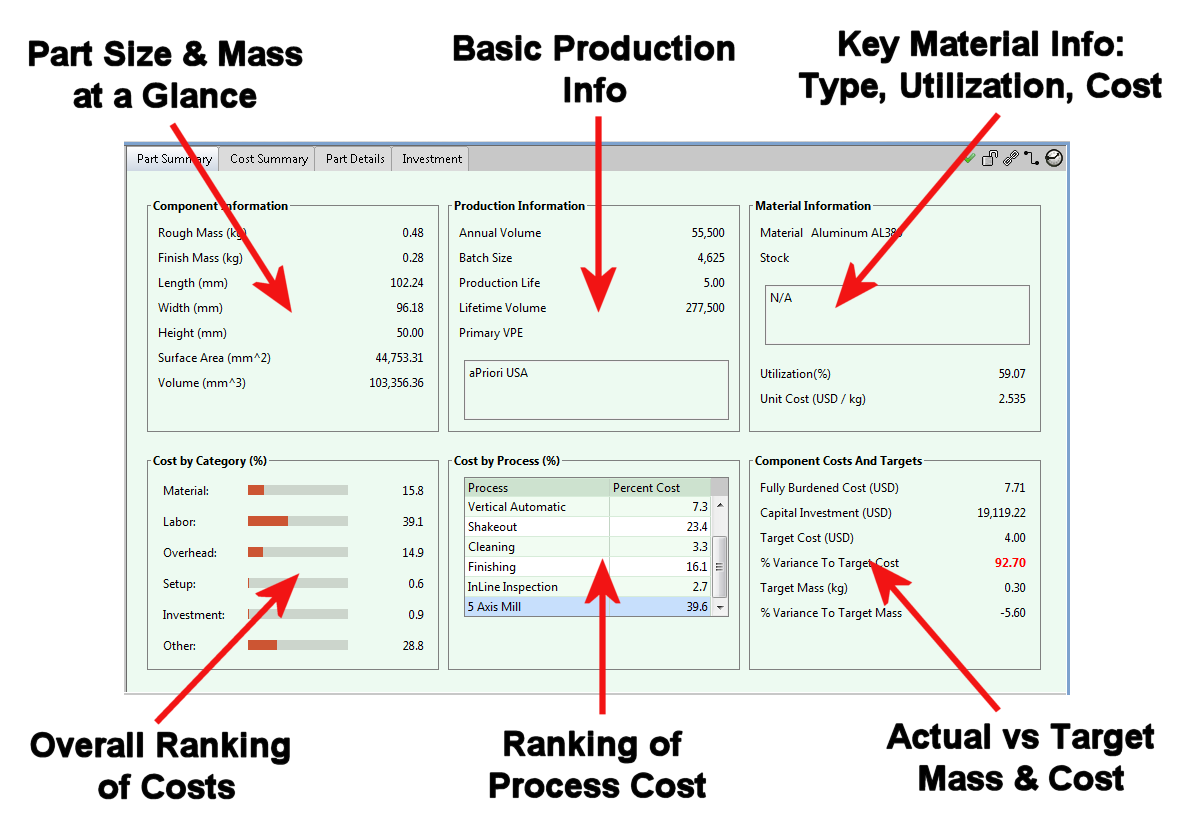 Examine the different panes to quickly identify areas of cost that exceed targets and expectations, and which could be targeted for cost reduction at the design level.