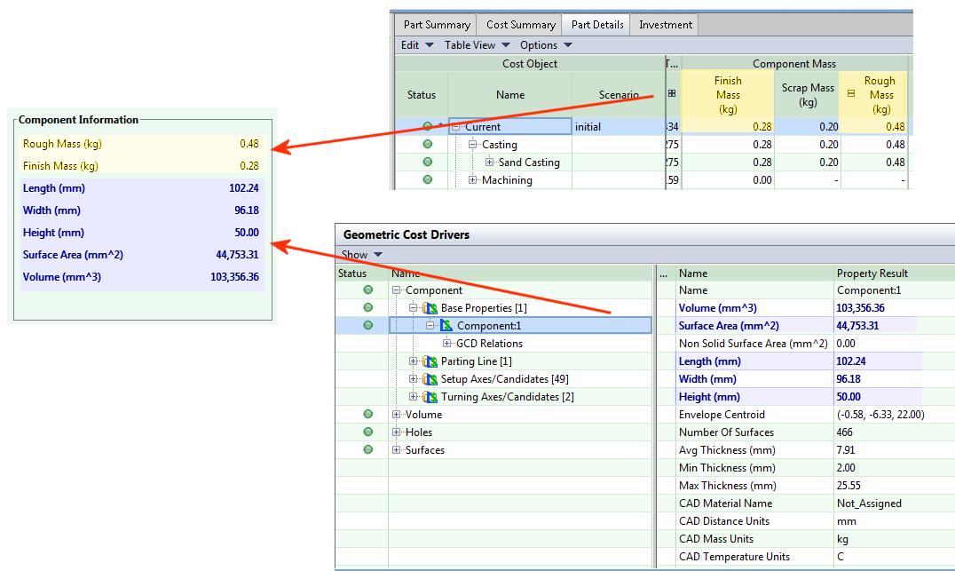 This mass and part size summary combines information from the Component properties of the