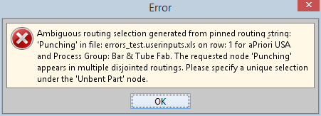 If you specify an ambiguous routing, aPriori will generate an error message when it attempts to open a Bulk Loader that reads this spreadsheet. (Error messages are displayed as soon as the error is encountered. You may need to iterate through multiple errors and fixes when debugging changes to a User Inputs spreadsheet.)