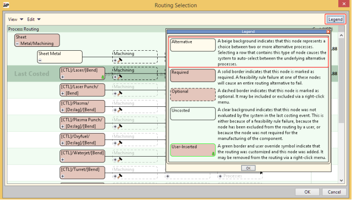 The key to specifying a valid routing is to identify relevant Alternative nodes (which are prominently highlighted in beige in the Routing Selection window), and then specifying one of the nodes under the Alternative node. (If you do not specify a node underneath a particular Alternative node, then all possible sub-routings downstream from that Alternative node are evaluated.)