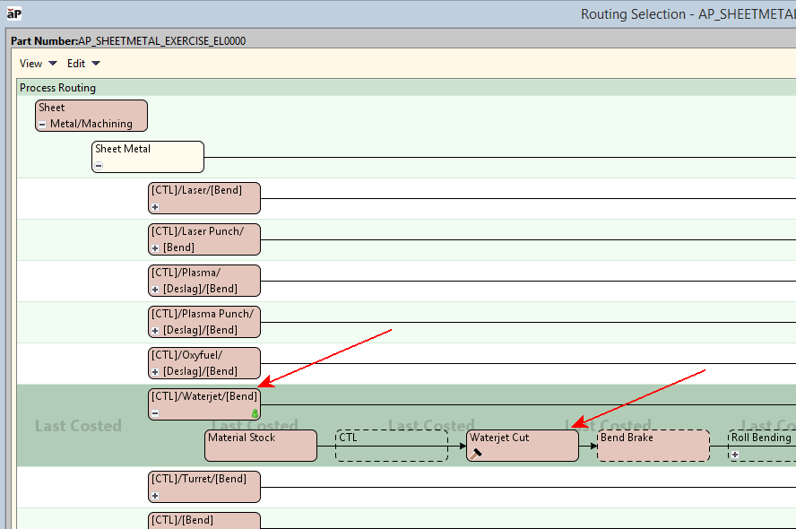 Consider the following Waterjet Cut routing in the Sheet Metal process group: