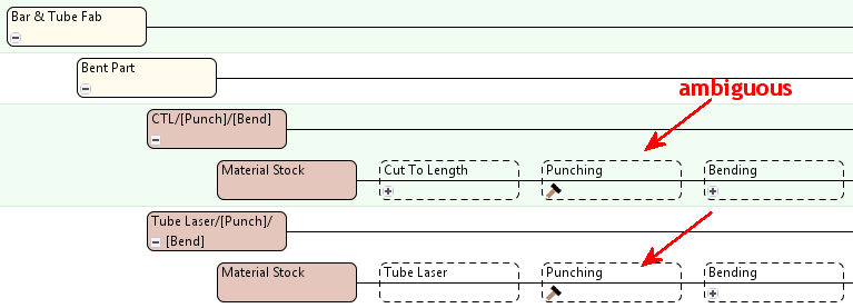 However, in a similar process in the Bar & Tube process group, specifying the non-canonical “Punching” node would not work because it exists in more than one routing. You need to specify the canonical format “Bent Part, [CTL]/[Punch]/[Bend]” (or at least “[CTL]/[Punch]/[Bend]”) to successfully specify a non-ambiguous routing.