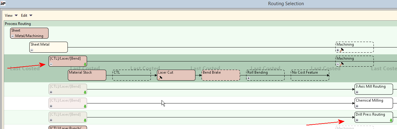 Note: When defining comma-separated routings, it can be helpful to collapse/expand nodes using the Routing Selection UI to visualize the nodes that you do and do not need to specify. Further note in the example above that Machining (in this case, Drill Press Routing) is a secondary process and it applies to all the routing options under the Primary process. So, no matter what path is chosen from the primary routing, when you exit, you enter the machining routing.
