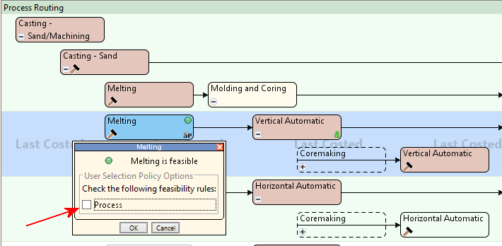 If you specify only “VerticalAutomatic” in the pinnedRouting column, aPriori will evaluate only the VerticalAutomatic routing branch in Casting – Sand, but it will evaluate all possible secondary machining routings for that scenario.