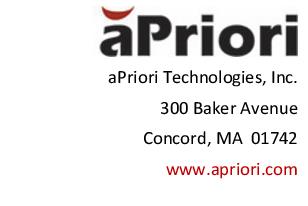 Cost Object | An entity that has costs associated with it. aPriori has three different types of cost objects: parts, assemblies, and Cost Roll-ups. |