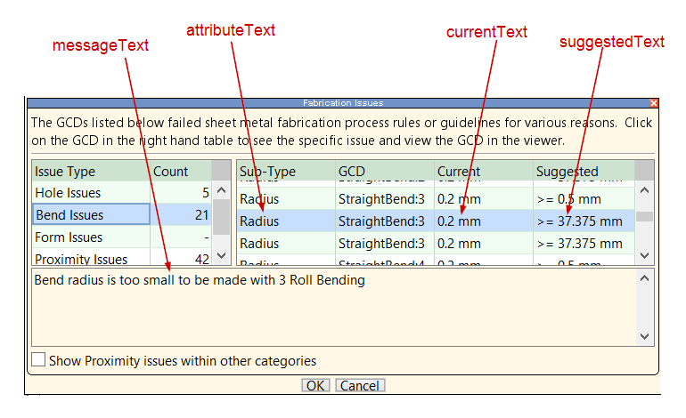 • category: free-form string that is used to categorize advice messages. For example, the value of category is DTC_PROXIMITY (defined as the string 'proximityWarning') for any dtcMessage object that is used to report a proximity issue in the Fabrication Issues dialog for the Sheet Metal process group.