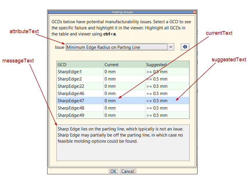 If you want to display advice in the Plastic Issues or Casting Issues dialog, set some or all of the following fields in your call to the dtcMessage function (the fields attributeId and custom.panelOutput are required; other fields are optional):