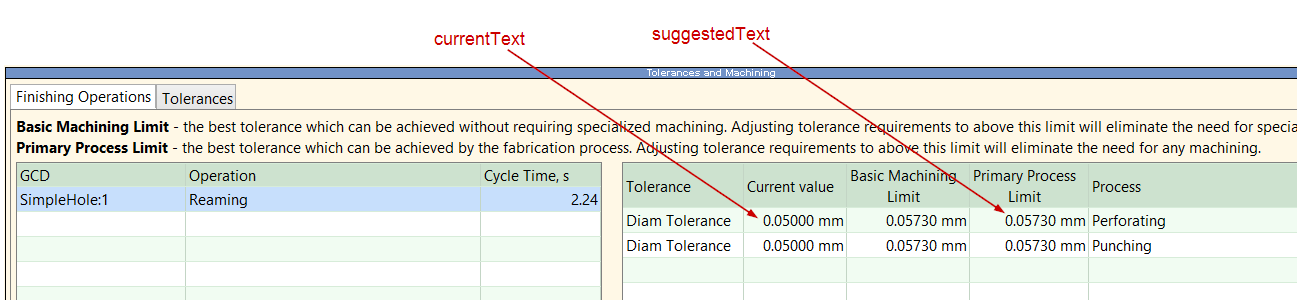 The value of the currentText field is used to populate the Current column of the table in the Casting Issues, Plastic Issues, or Fabrication Issues dialog. It is also used to populate the Current value column of the table in the Finishing Operations tab of the Tolerances and Machining dialog.