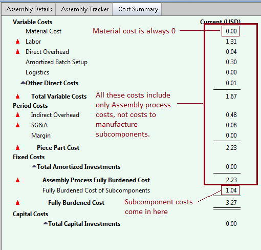 • Subcomponent process costs are listed at Fully Burdened Cost of Subcomponents.