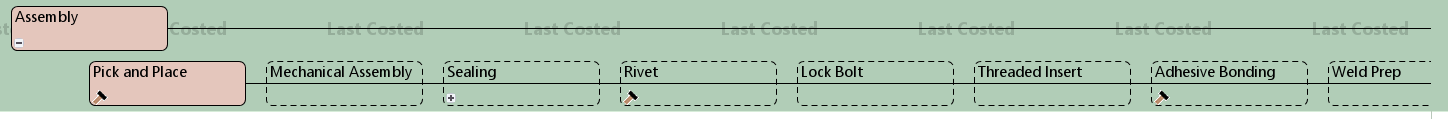 Assembly process group routings consists of Pick and Place followed by Mechanical Assembly, various sealing, fastening, and bonding processes, and/or Welding. Welding (except Ultrasonic Welding) is optionally preceded by Weld Prep and optionally followed by Weld Clean Up.