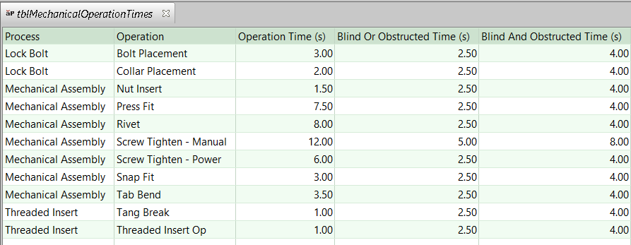• Standard manual screw tightening time: by default, this is looked up by the current process and operation in the lookup table tblMechanicalOperationTimes (12 seconds in aPriori starting point Digital Factories).