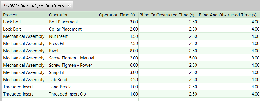 For Lock Bolt and Threaded Insert setup options, the lookup table tblProcessSetupOptionSelection lists the possible settings. The entry with 1 in the priority column provides the default for all setup options.