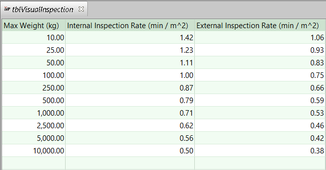 • Internal inspection rate: looked up by weight in the lookup table tblVisualInspection.