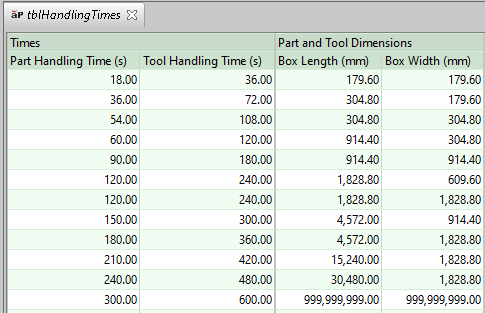 • Move to autoclave cell time: looked up by tool length and tool width in the Tool Handling Time column of the lookup table tblHandlingTimes.