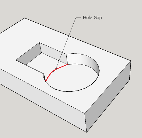 maxHoleGap: specifies the maximum number of degrees of arc that can be missing from an extracted hole’s wall. Holes with missing wall portions can sometimes be created with drilling, and so are sometimes recognized as hole GCDs. But if more than this amount is missing, no hole GCD is recognized, and a curved wall GCD is extracted instead. The default maximum hole gap is 180 degrees. In other words, if no more than half of the wall is missing, a hole GCD is recognized by default.