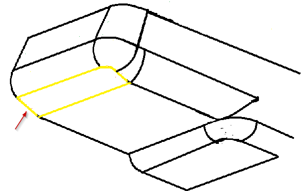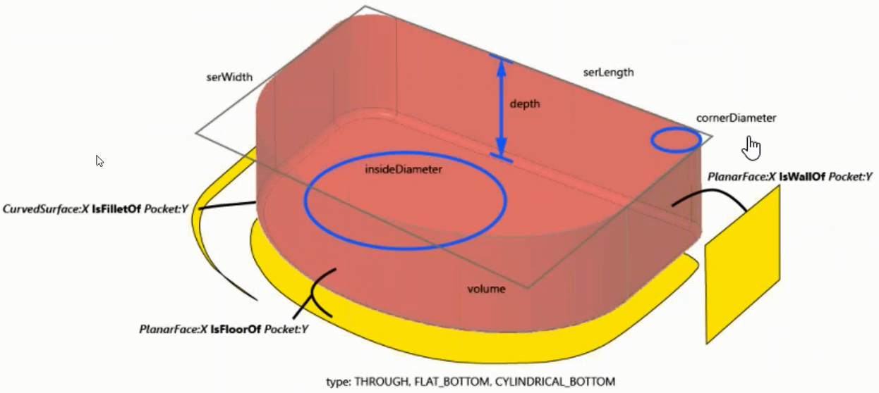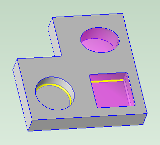 • The square volume (shown in purple) with a flat floor and fillets (one is shown in yellow) is recognized as a pocket.