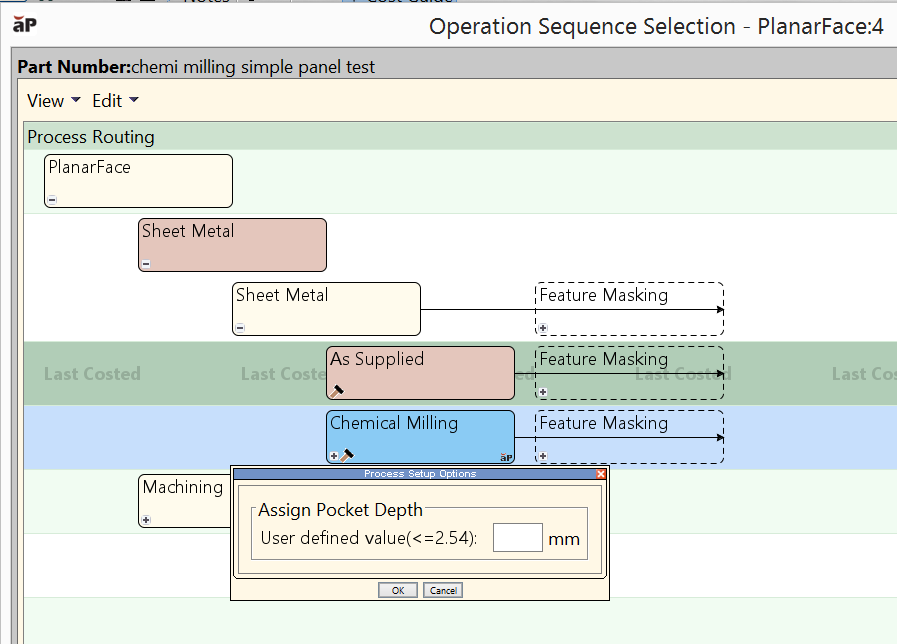 If you don’t enter an etch depth, the cost model uses the depth of the shallowest form of type STAMP, if there is one; otherwise, the cost model uses 50% of the blank thickness.