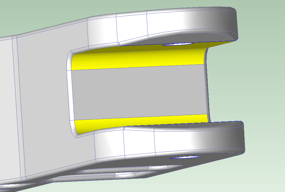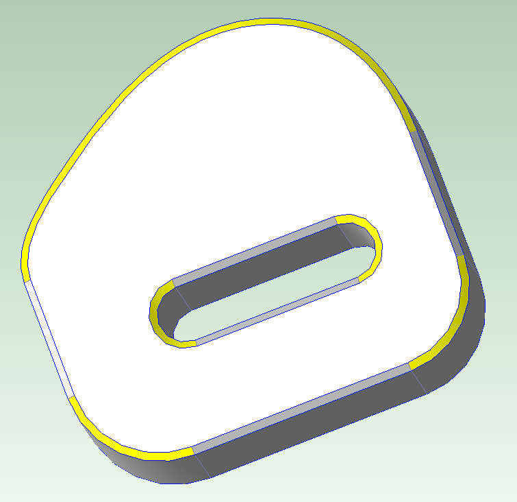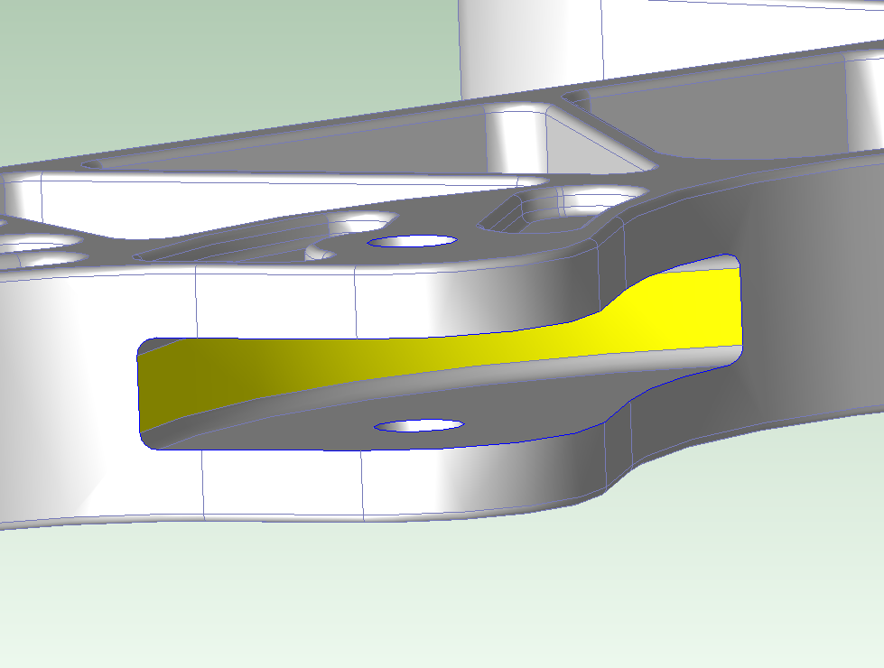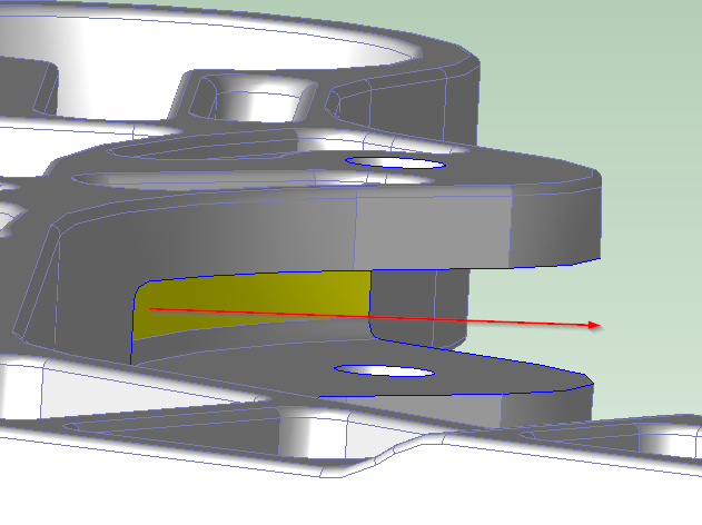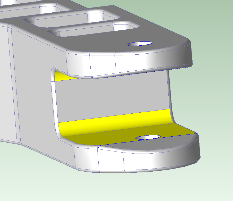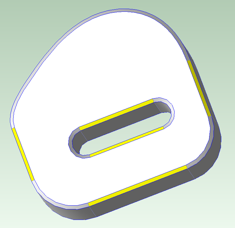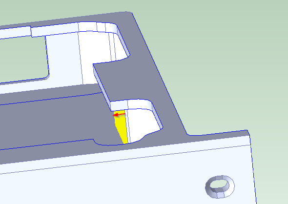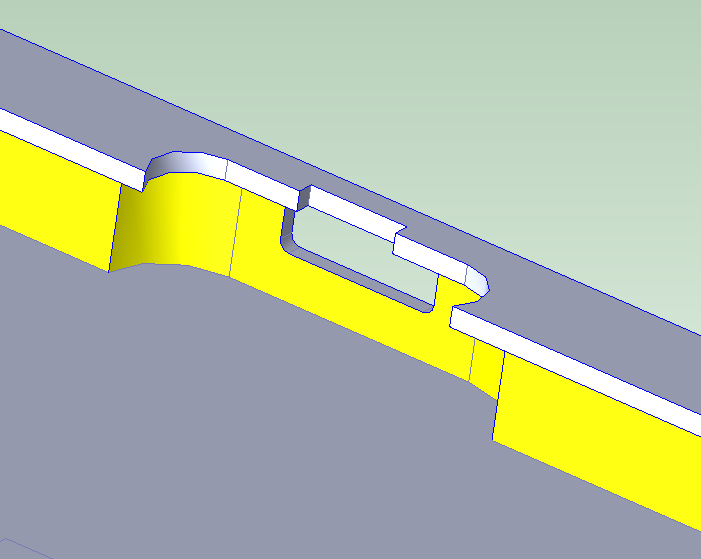 Given the assignment of Undercut Milling to the curved wall as shown above, the following illustrations show the surfaces (in yellow) to which it is appropriate to assign No Cost Feature, since these surfaces will also be created by the Undercut Milling operation: