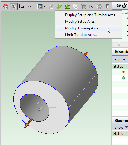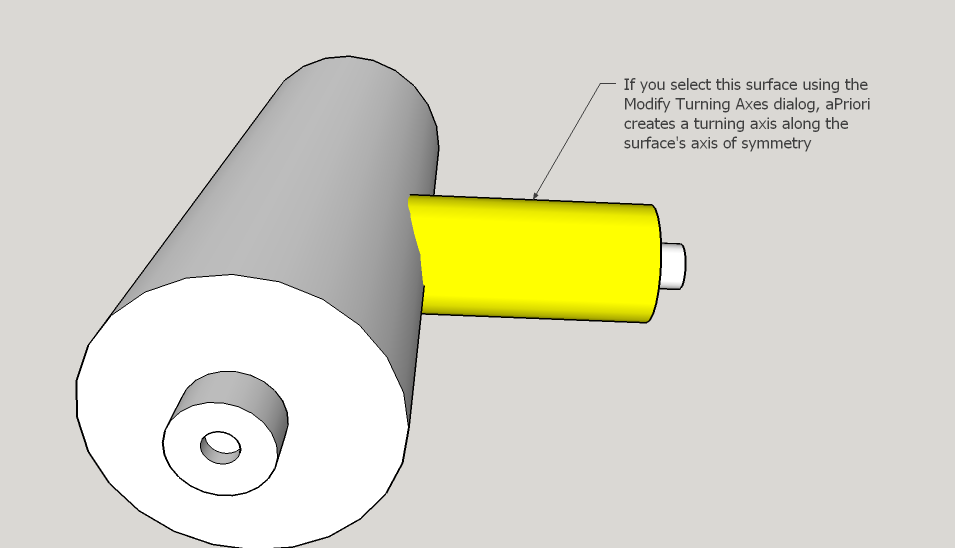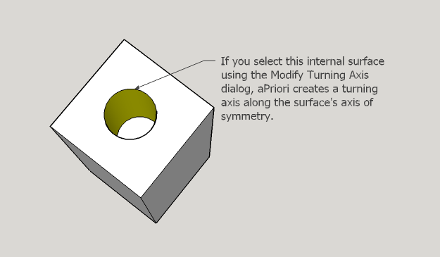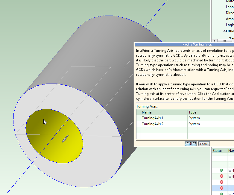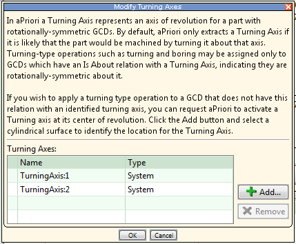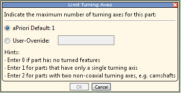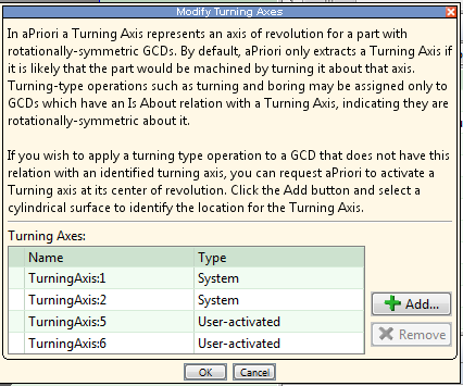 aPriori automatically creates candidate turning axes during geometry extraction. How many are automatically created depends on both the geometry of the current part and the current process group (see