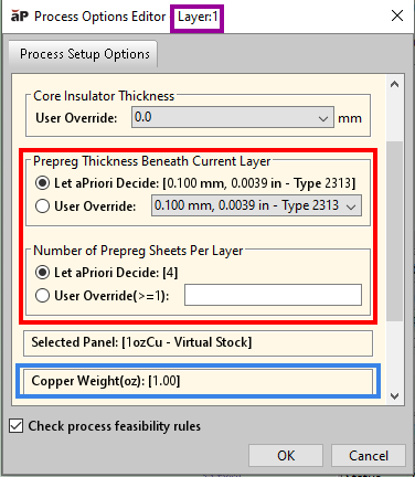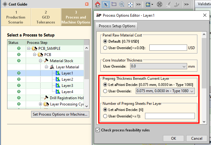 The following setup options show the current thickness of each sheet of prepreg beneath a given Layer GCD and the number of sheets of prepreg beneath a given Layer GCD: