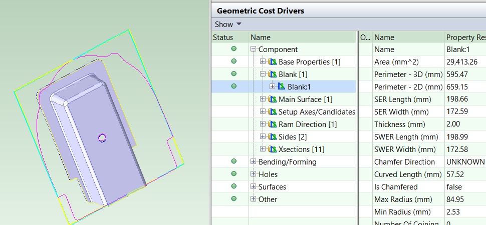 The Blank GCD is specific to the Sheet Metal process groups. It represents the flattened part. Its properties (such as Perimeter, Thickness, SER Length, and SER Width) are listed in the Geometric Cost Drivers pane, and are all independent of the blank’s orientation on the stock coil or sheet during offline blanking or laser cutting.