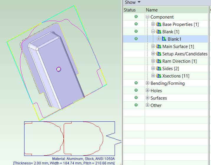 • Blank SWER in blue: this is the smallest-width rectangle that encloses the blank (used primarily by the Transfer Die process group).