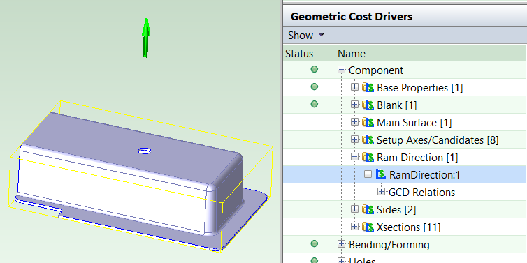 The RamDirection GCD represents the direction from which the bladder approaches the blank (which sits between the bladder and the tool). aPriori chooses a part-relative ram direction as described in
