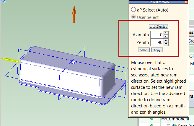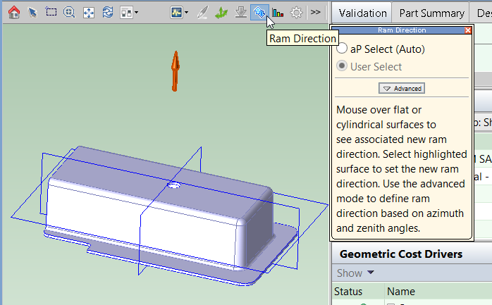 You can override aPriori’s choice of ram direction by using the Ram Direction tool,